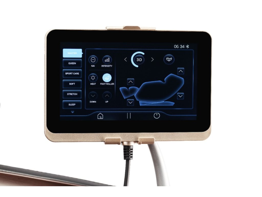 Kreslo má moderné ovládanie pomocou plne dotykového 7" grafického displeja, alebo pomocou vstavaného ovládania s tlačítkami v pravej opierke s otočným 3D jog controllerom pre okamžitú zmenu intenzity masáže.