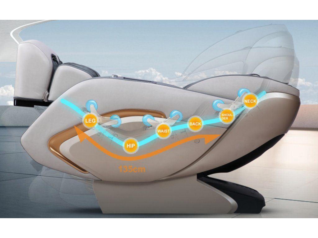 Celotelová masáž je zabezpečená 38 vzduchovými vankúšmi, 3D masážnymi hlavicami pracujúcimi v 135cm dlhej SL trajektórii od krku až pod sedacie svaly, sadou 3 valčekou pre reflexnú masáž chodidiel.
